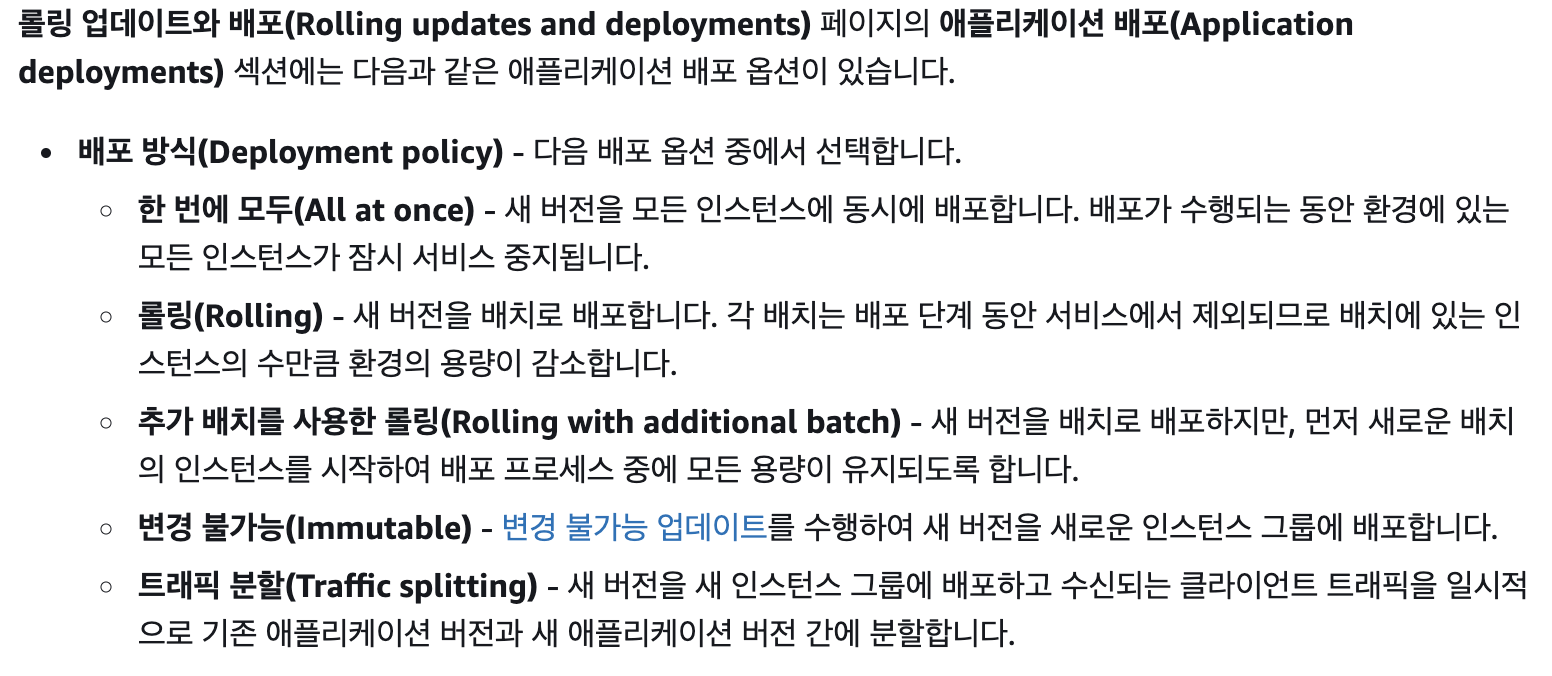 AWS 엘라스틱 빈스톡의 배포 방식에는 아래와 같이 5가지가 있는데 (AWS 공식 문서)