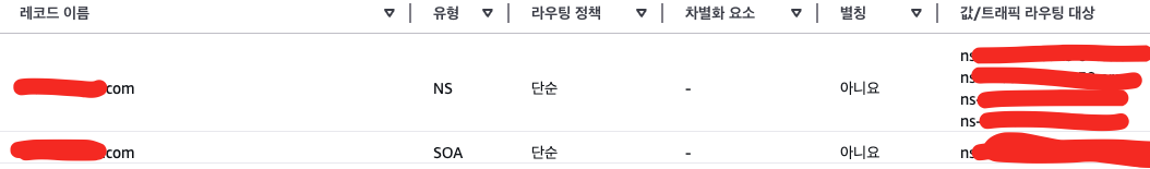아래와 같이 NS, SOA 유형의 레코드가 생성되어 있다.