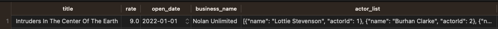 문제: 페이지 하단 참고자료의 SQL 키워드들과 MySQL의DQL(Data Query Language)를 사용하여, 아래 결과가 출력될 수 있는 쿼리문을 작성해주세요. 특정 배급사(Nolan Unlimited)의 영화 중 가장 높은 평점을 받은 영화의 모든 정보와 출연 배우 목록을 다음과 같은 형태로 출력해주세요.