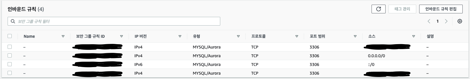 RDS 인스턴스에 접속하는 방법은 두가지가 있다. 1. 로컬PC에서 접속 (public access 허용했을시에만 가능) 2. EC2로 접속 [ 로컬 PC에서 직접 접속 ] 1. 생성한 데이터베이스의 보안그룹 수정 생성한 데이