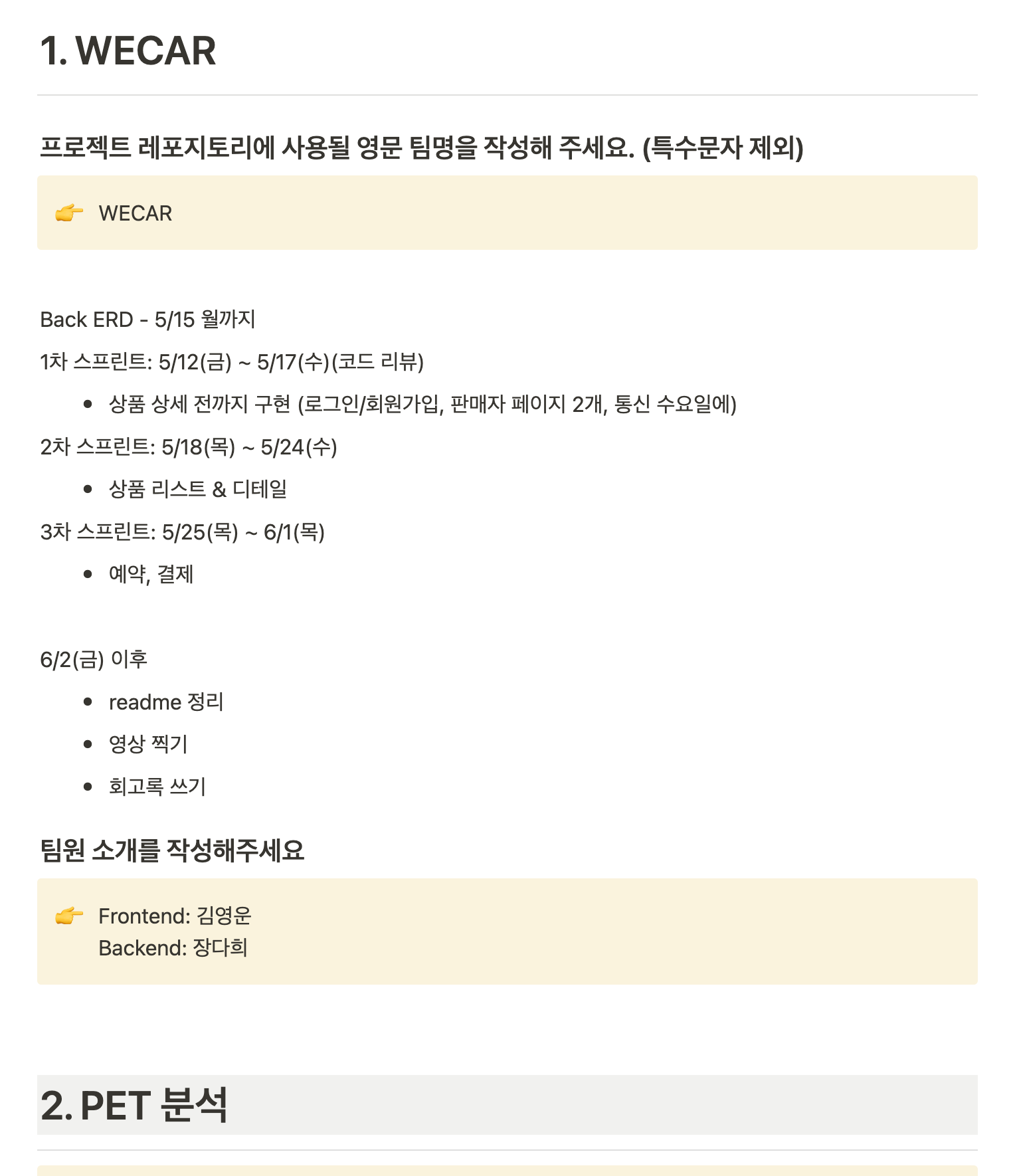 우리는 학원에서 해보고 싶었으나 다른 주제에 밀려 못해본 프로젝트를 이 기회에 해보기로 했다. airbnb를 모델링하여 c2c 차량 대여 플랫폼을 만드는 것이었다. Notion에 producting을 담은 기획안과 sprintq별 계획을 준비해 사수님께 프로젝트를 제안드렸다.